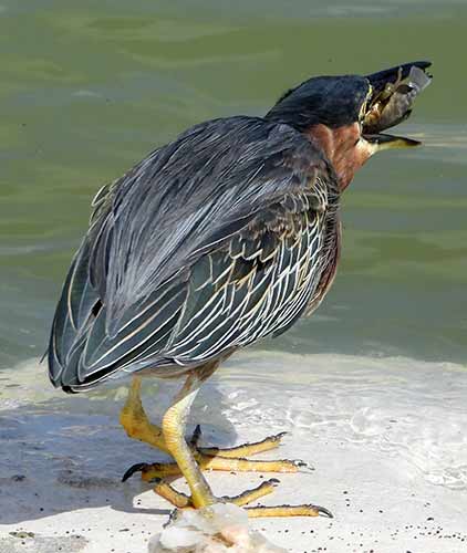 Een groene reiger die zijn vangst met de kop naar beneden opeet.